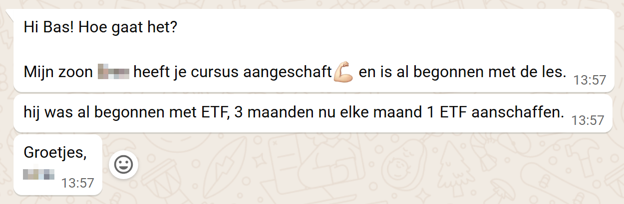 Laat je e-mail adres achter en ik stuur je de komende weken een aantal waardevolle en (hopelijk) vermakelijke e-mails. Over wie ik ben en wat ik doe, ETF's (wat, hoe, waarom, welke), pensioen beleggen, crowdfunding, gedrag, een goochelaar, je eerste strategie, een mountainbike en nog veel meer.