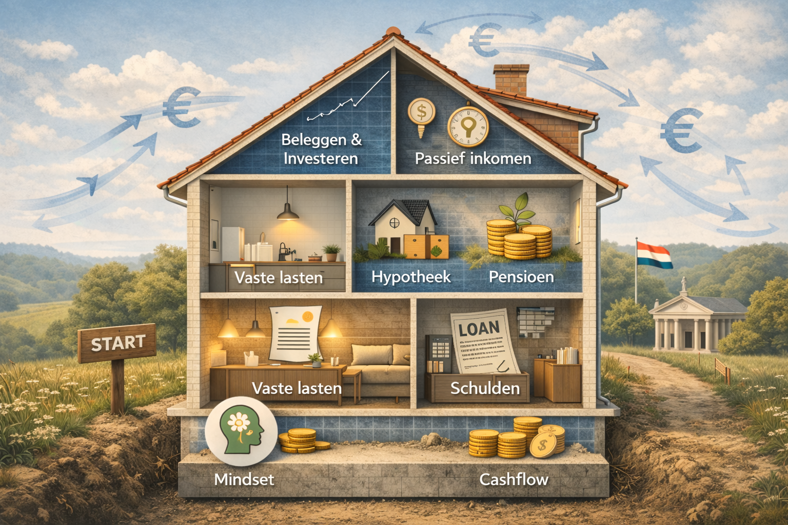 We beginnen bij de basis en bouwen stap voor stap op. Mindset, cashflow, vaste lasten, schulden, hypotheek, pensioen, beleggen en investeren. Ook thema’s als passief inkomen en geld voor je kinderen, de overheid en hoe geld (echt) beweegt krijgen een plek. Alles hangt met elkaar samen en wordt in de juiste volgorde behandeld.