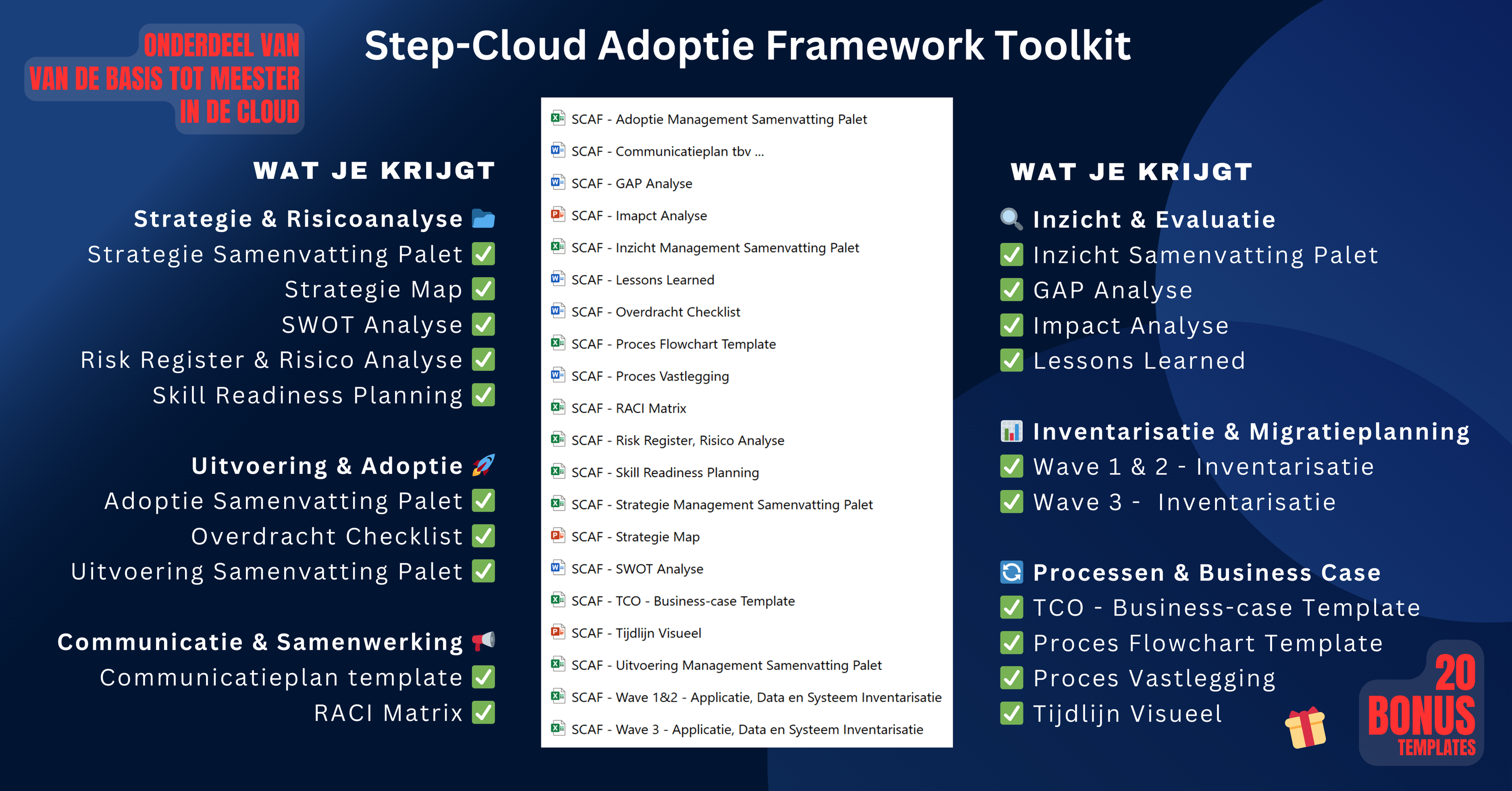 Een complete set aan praktische tools, templates en voorbeelden waarmee je cloudtheorie moeiteloos omzet in concrete actie. Ideaal om teams te verbinden, keuzes eenvoudiger te maken en direct resultaat te boeken—of je nu zelfstandig werkt of samen met anderen binnen je organisatie.