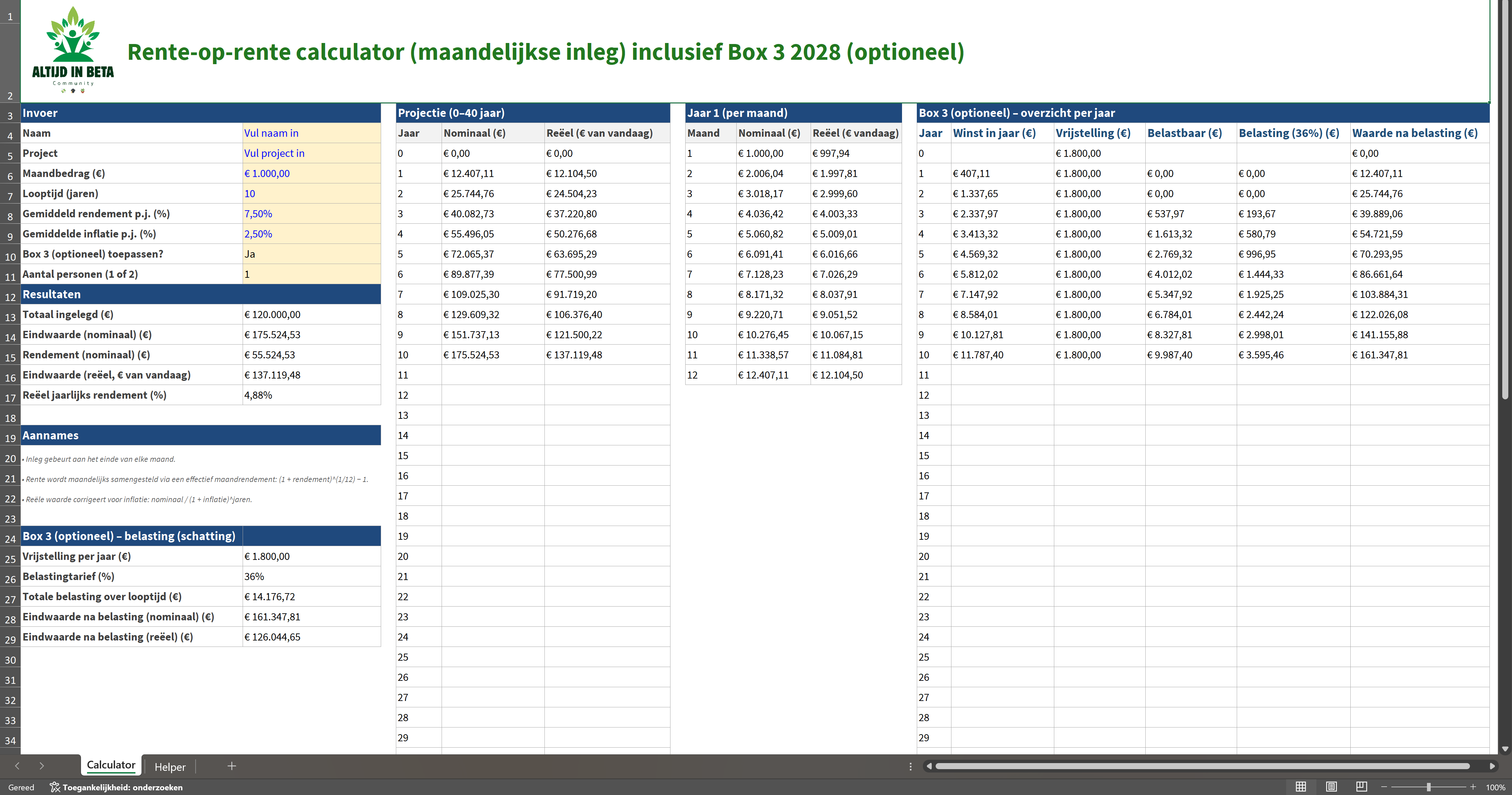 De box 3 optie is overigens optioneel, die kun je aan en uit zetten. Voor 1 persoon, of twee, i.v.m. de vrijstelling.