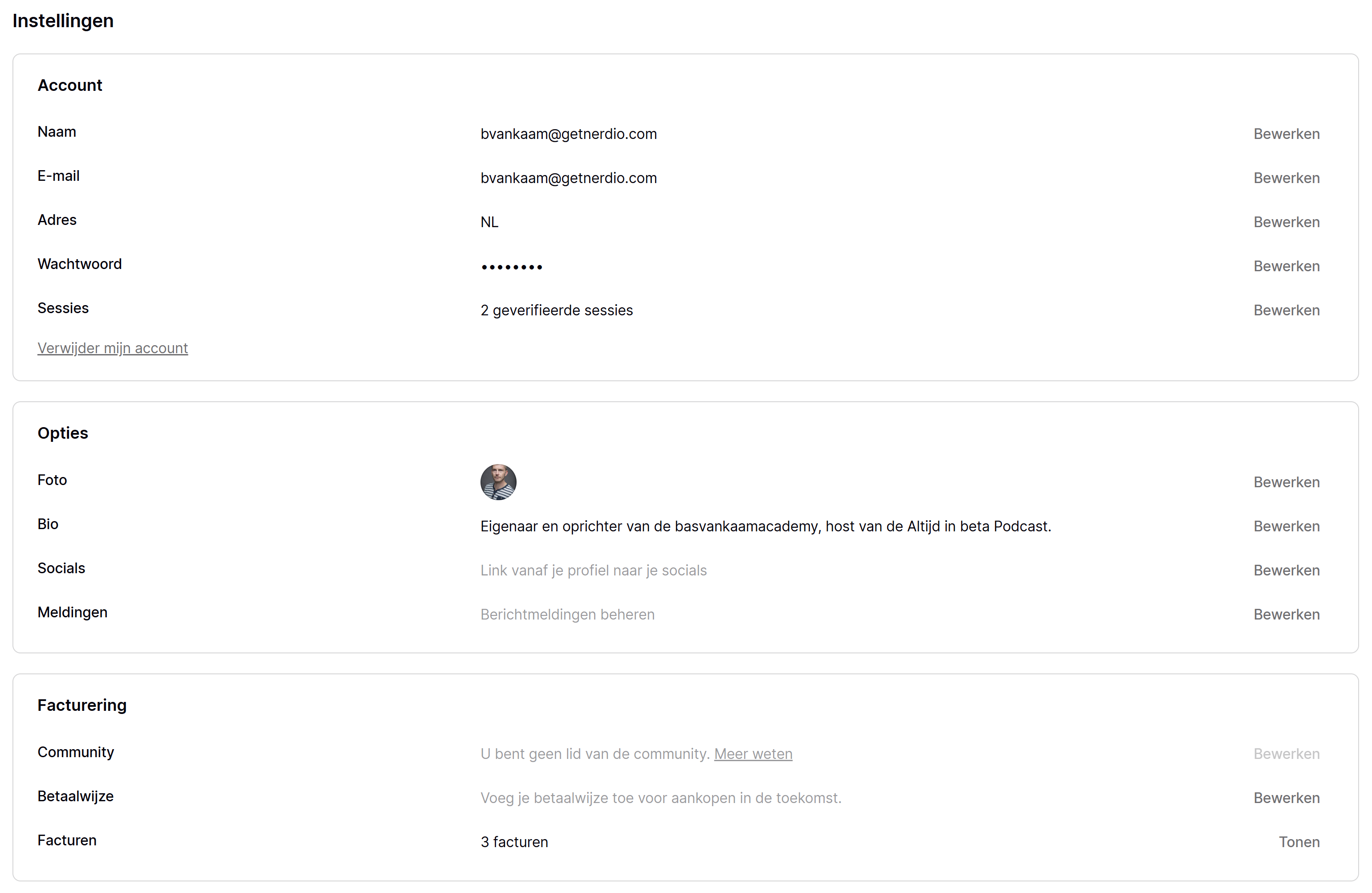 Daar kun je vervolgens al je persoonlijke gegeven aanpassen, je foto, eventuele facturen downloaden, meldingen beheren, een bio invullen, je watchword wijzigen en meer.