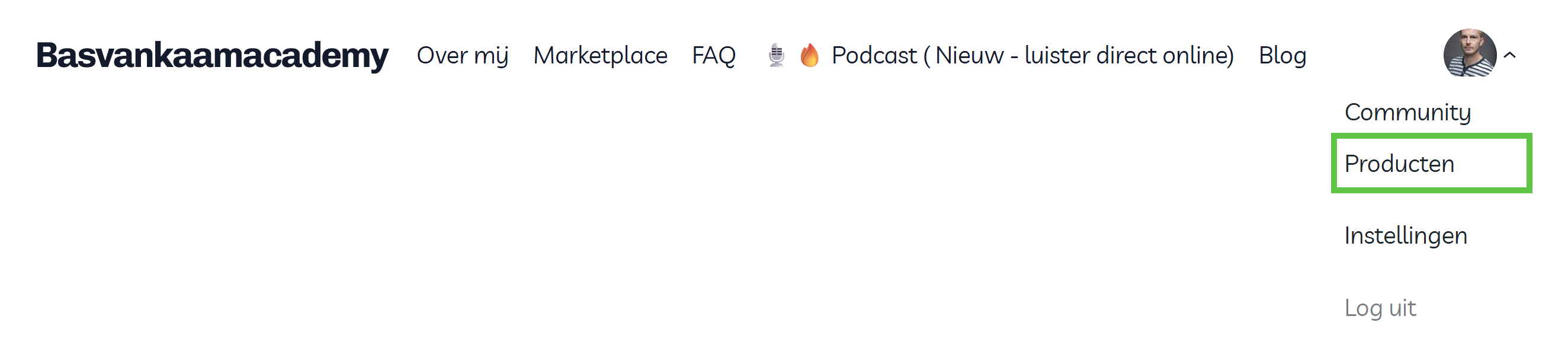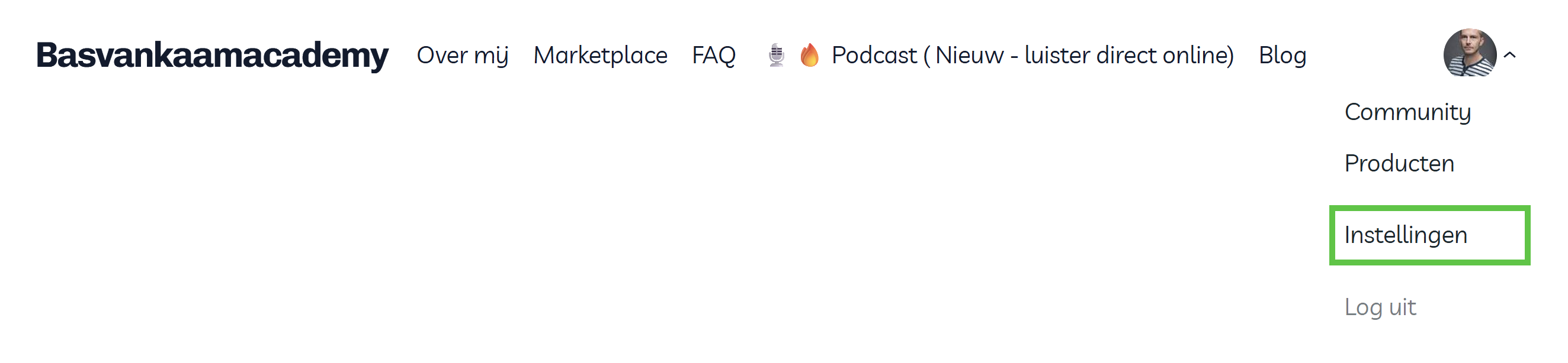 Rechts bovenaan (zie ook onderstaande afbeelding) op de basvankaamacademy website vind je je eigen privé omgeving.