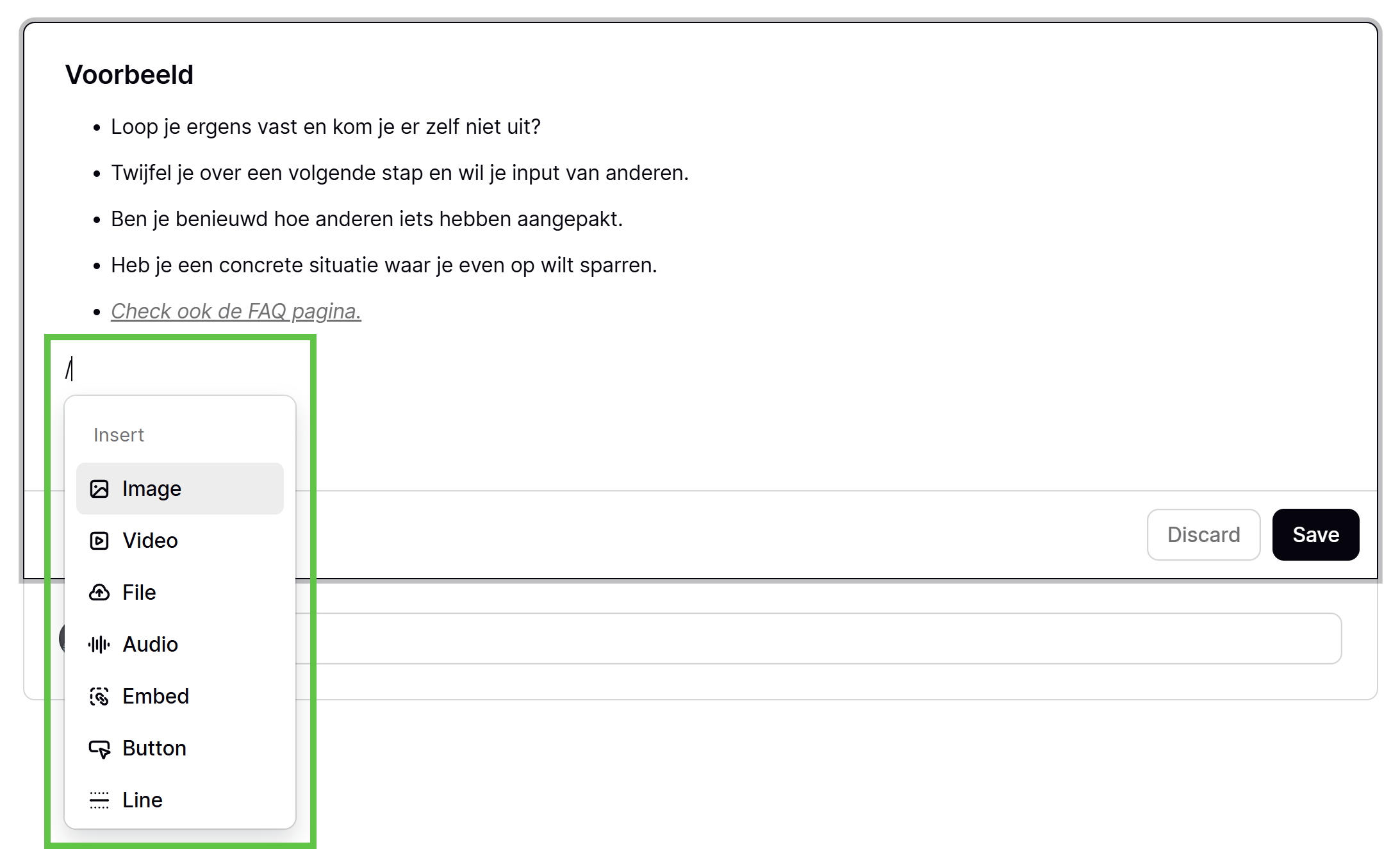 Nog voordat je begint met typen (optioneel), kun je toegang krijgen tot een ander menu. Hier vanuit kun je o.a. afbeeldingen plaatsen, video's delen, bestanden, audio, en meer: