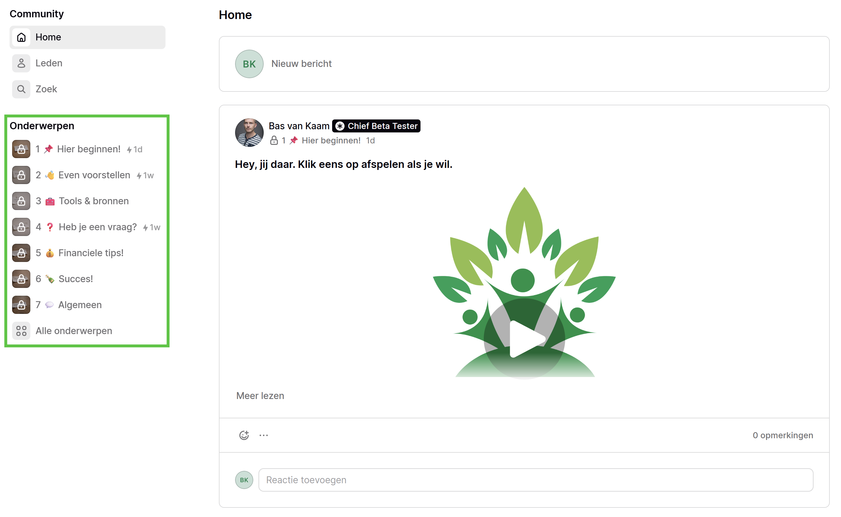 Let op, in dit voorbeeld betreft het een beperkt onderwerp "Hier beginnen!", die door mij wordt beheerd. Je kunt daar als gast geen nieuwe berichten (Posts) aanmaken. Binnen alle andere onderwerpen kan dat wel, zie verderop. Goed om te weten: dit is het enige door mij beheerde onderwerp, de rest is open.
